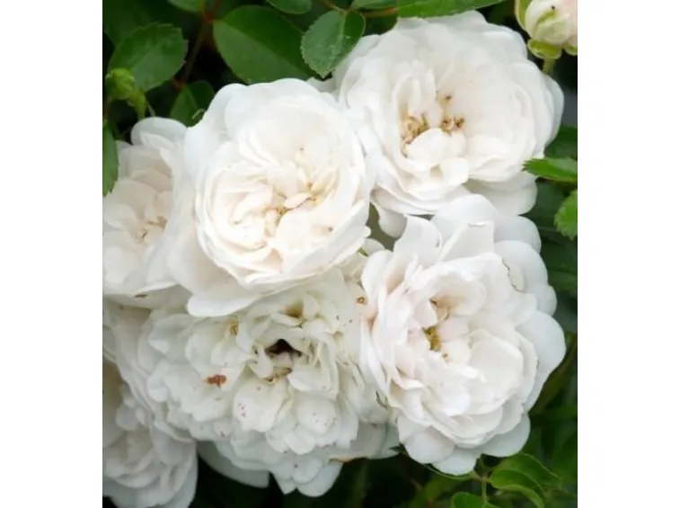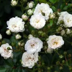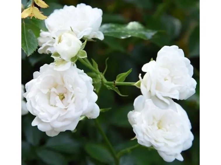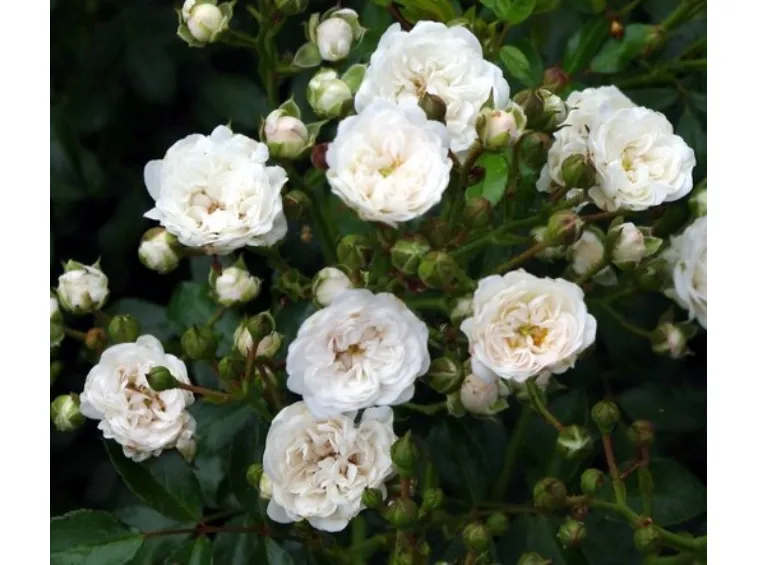 Kleine, schalenförmige, gefüllte Blüten mit einem Durchmesser von 3–4 cm, bestehend aus 17–25 reinweißen Blütenblättern. Die Blüten stehen in lockeren, luftigen Dolden mit 5–10 Blüten. Die Rose wächst breit und stark verzweigt und erreicht etwa 50–70 cm Höhe sowie bis zu 120 cm Breite (mit zunehmendem Alter vor allem in die Breite wachsend).