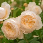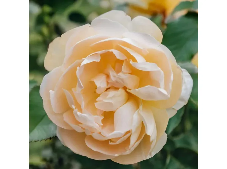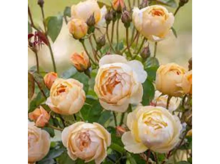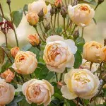 Mittelgroße, schalenförmige Blüten mit einem Durchmesser von etwa 5 cm, in Dolden angeordnet, bestehend aus 33 aprikosen-gelben, duftenden Blütenblättern.