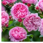 Große, schalenförmige, sehr gefüllte Blüten mit einem Durchmesser von etwa 9 cm, bestehend aus 100 rosa Blütenblättern, die mit der Zeit lavendelfarben werden. Der Duft ist moderat, typisch für historische Rosen. Die Blüten erscheinen in Dolden von 3–5 Blüten über die gesamte Saison.