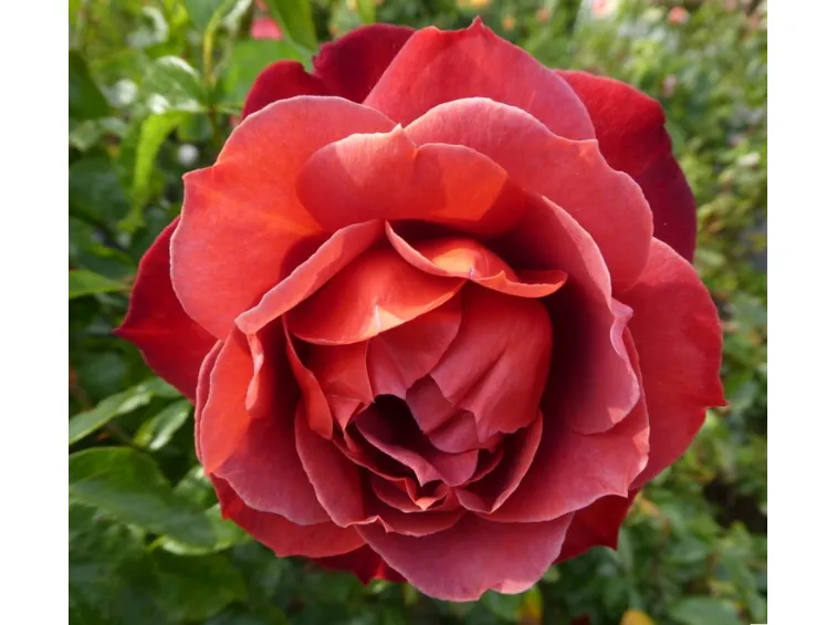 Rose mit einer außergewöhnlichen und einzigartigen Farbe: gewellte, bräunlich-rötliche Blütenblätter (in kühleren Regionen kastanienbraun, in wärmeren Gegenden eher pfirsichrot). Eine Sorte ohne Rivalen unter den braunen Rosen.