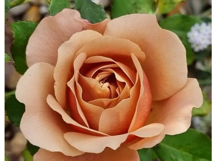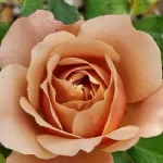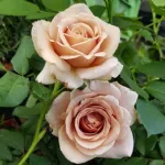 Gefüllte, schalenförmige Blüte mit einem Durchmesser von 10 cm, bestehend aus ca. 40 Blütenblättern mit einer außergewöhnlichen und einzigartigen 'Café au lait'-Farbe, die beim Verblühen allmählich in Lavendel- und Schokoladentöne übergeht; zart duftend; sie blüht wieder.