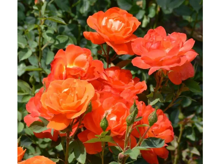 Gefüllte, schalenförmige Blüten mit einem Durchmesser von etwa 11 cm, bestehend aus 25 leuchtend orangefarbenen Blütenblättern mit feinem Duft. Öfterblühend und krankheitsresistent. Die Rose wächst buschig und erreicht etwa 80 cm Höhe sowie 80 cm Breite. Das Laub ist dunkelgrün und matt.
