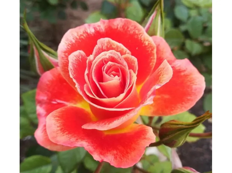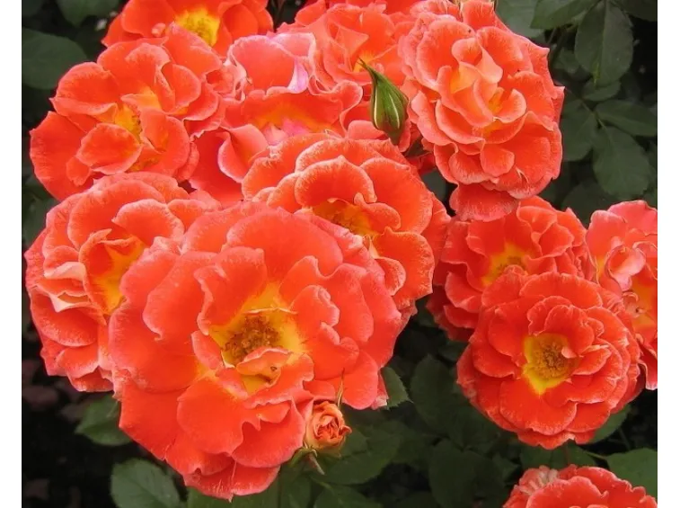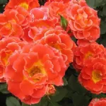 Flache, halbgefüllte Blüten mit einem Durchmesser von etwa 10 cm, bestehend aus rund 16 rot-orangenen Blütenblättern mit weißem Rand. Die Blüten erscheinen in kleinen Dolden, sind öfterblühend und leicht duftend. Die Rose erreicht eine Höhe von bis zu 90 cm, wächst aufrecht und dicht verzweigt mit sehr wenigen Dornen; sie besitzt ein gesundes, großes, halbglänzendes Laub in bronzegrüner Farbe.
