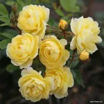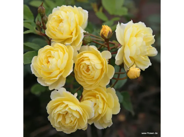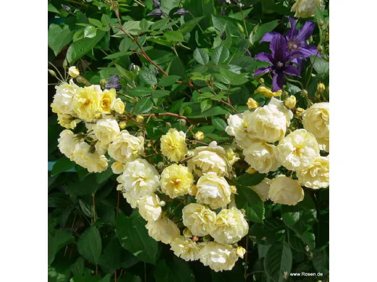 Romantische, gefüllte, schalenförmige Blüte, Durchmesser 4 cm, zitronengelb, blüht in leicht duftenden Trauben. Aufrechter und gut verzweigter Wuchs, mäßige Wuchskraft, daher ideal für kleinere Gärten, erreicht 180 cm Höhe und 70 cm Breite.