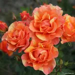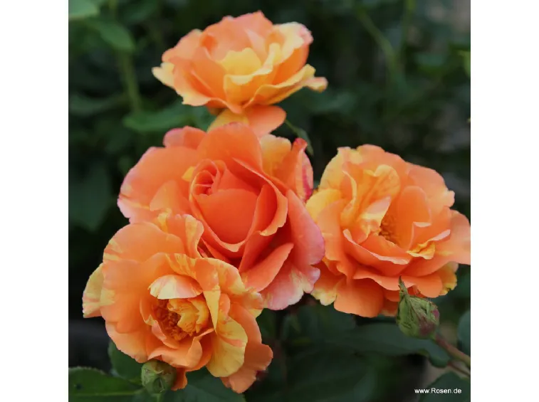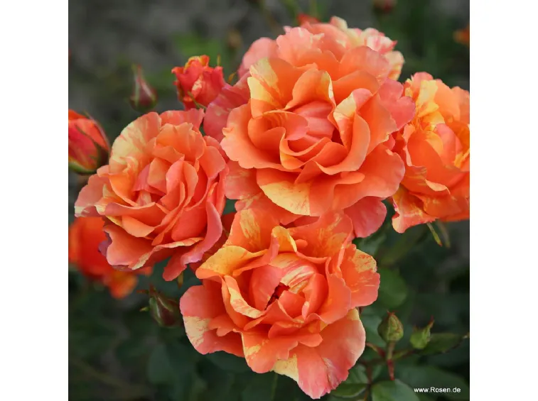 Gefüllte, schalenförmige Blüte mit einem Durchmesser von 7 cm, orange-gelb gesprenkelten Blütenblättern mit gezackten Rändern und leicht duftend. Sie ist sehr krankheitsresistent und wächst buschig und aufrecht bis zu 60 cm hoch und 40 cm breit. Eine pflegeleichte Rose mit gesundem Laub, die sich für die Topfkultur eignet.