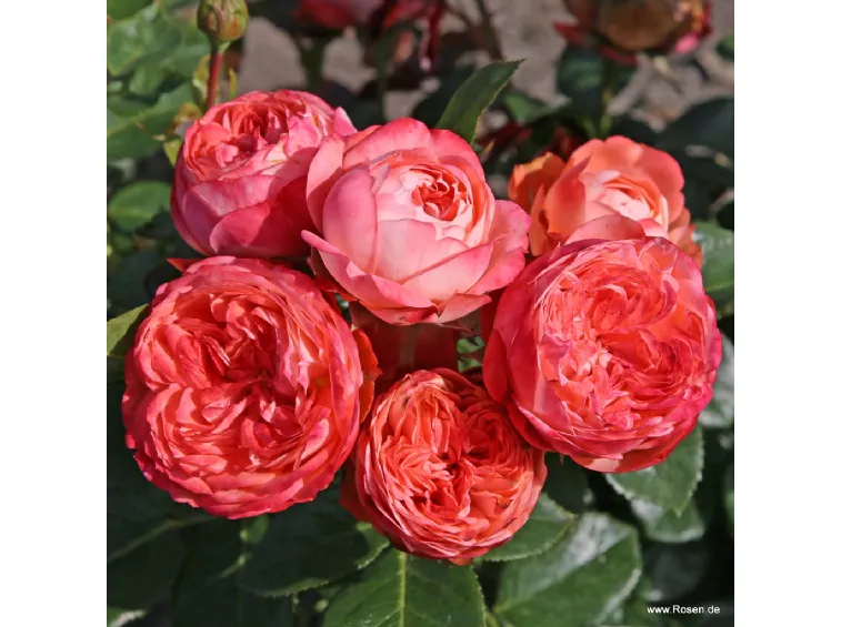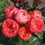 Romantische, gefüllte, schalenförmige, kugelförmige Blüte mit einem Durchmesser von 5 cm; besteht aus leicht duftenden, silber-orangen Blütenblättern. Wiederblühend; blüht in Büscheln; wächst aufrecht und gut verzweigt bis zu 50 cm hoch und 30 cm breit.