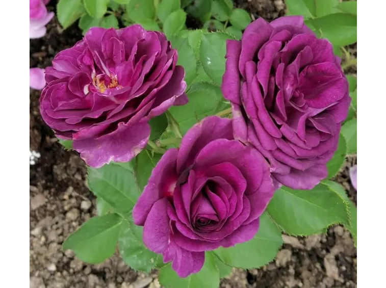 Die Blüten haben einen klassischen, alten Charakter, sind gefüllt, schalenförmig und erreichen einen Durchmesser von etwa 8 cm, mit ca. 40 dunkelvioletten Blütenblättern. Beim Öffnen zeigen sich leuchtend gelbe Staubgefäße, die den Gesamteindruck jedoch nicht stören. Minerva® besitzt einen süßen Duft, typisch für Rosen dieser Farbe. Die Blüten erscheinen in Dolden, halten lange und das Farbintensität nimmt während der Blüte zu.