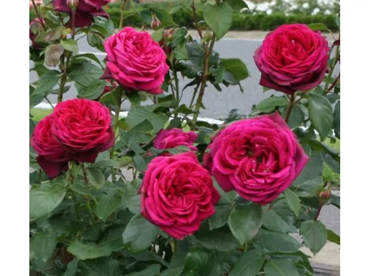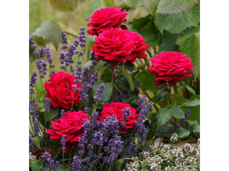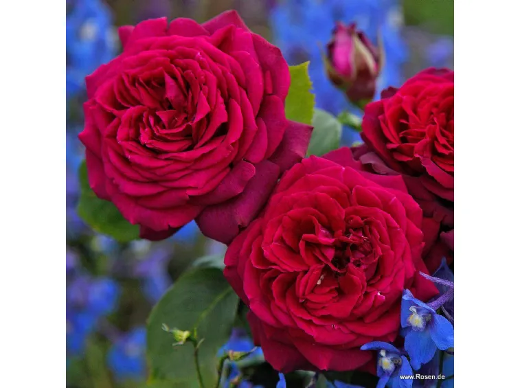 Elegante, gefüllte, schalenförmige Blüten mit einem Durchmesser von etwa 9,5 cm, bestehend aus über 41 rot-violetten Blütenblättern mit intensivem Duft. Die Knospen wirken unter bestimmten Lichtreflexen fast schwarz.
