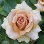 Doppelte Blüte in Kelchform mit einem Durchmesser von 9 cm, bestehend aus 30 Kaffeecremeblütenblättern mit einem matten Effekt und variierenden Schattierungen während der Blütezeit; zart duftend.