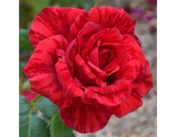 Elegante Hybrid-Tee-Rose in Rot mit dunklen Streifen, sehr kräftig und blühfreudig; ideal für den Schnitt und den Anbau im Topf.